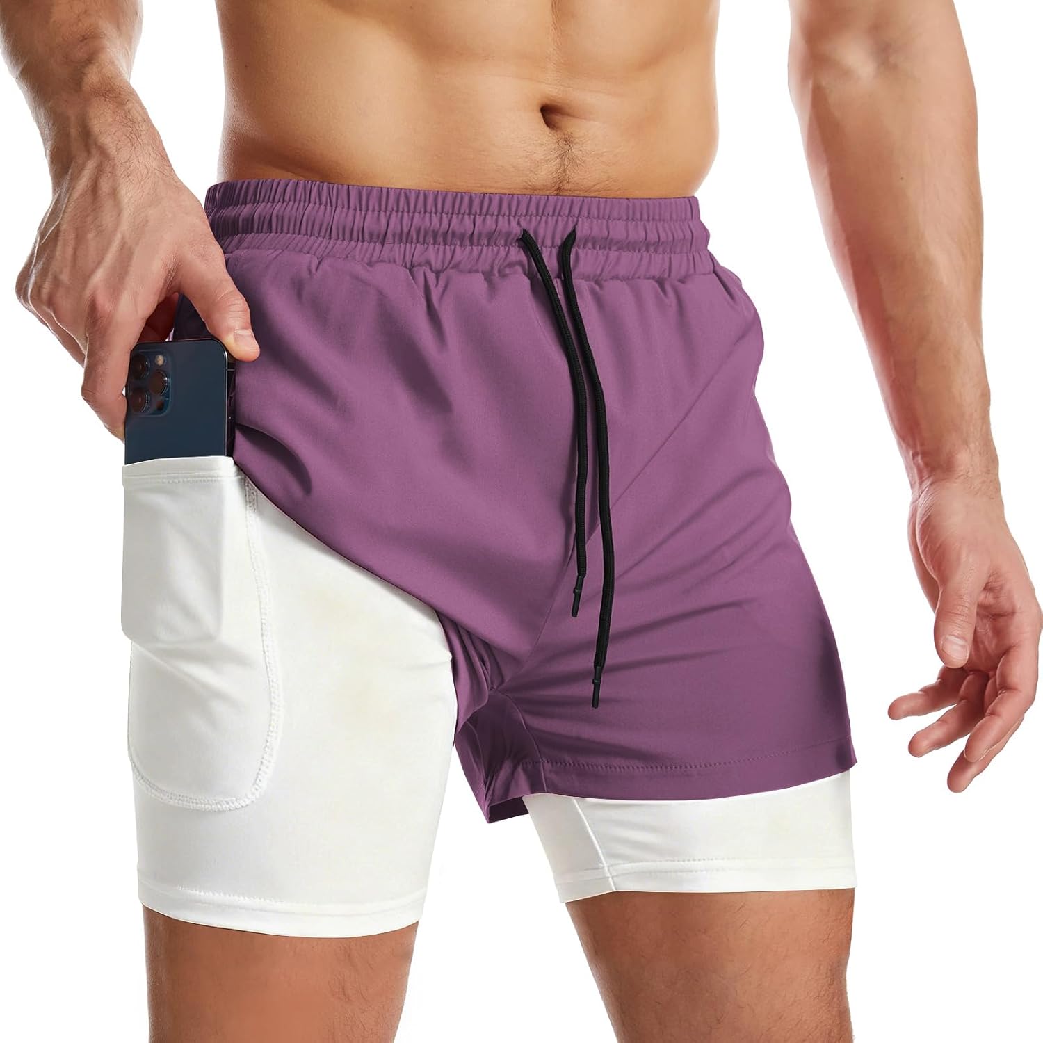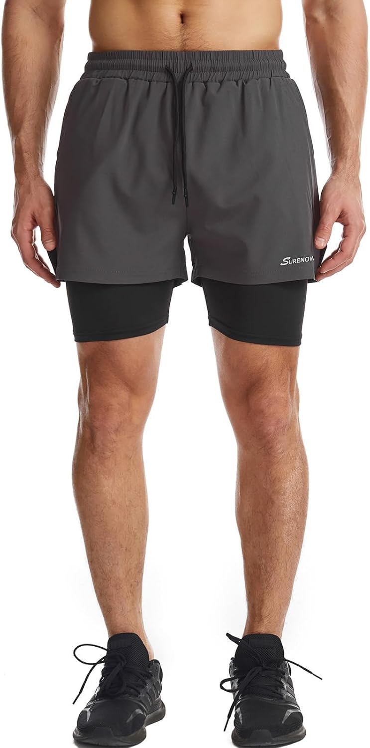 Surenow Mens 2 in 1 Running Shorts Quick Dry Athletic Shorts with Liner, Workout Shorts with Zip Pockets and Towel Loop