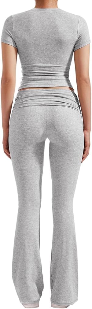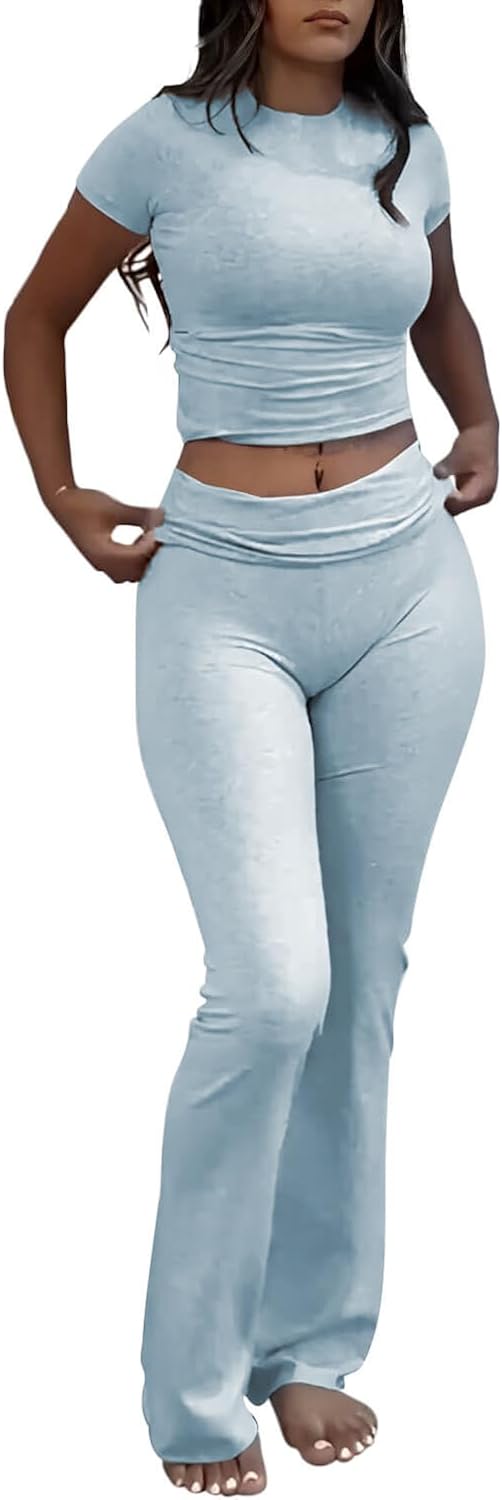 ZFLM Casual Workout Two Piece Outfits for Women Short Sleeve Crop High Waist Foldover Flare Pants Tracksuit Sets Streetwear